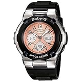 Baby-G shock resistant black molten resin band with silver tone accents.Water-resistant to 330 feet (100 M).LED light with afterglow.Full auto calendar, 12and 24 hour formats.Five daily alarms, countdown timer, 1/100 second chronograph. The pink dial of the Casio Women's Baby-G Shock Resistant Black and Silver-Tone Analog Sport Watch adds a feminine touch to this athletic watch. The analog display features silver-tone Arabic numerals and digital subdials at the three, six, and nine o'clock positions. The day, date, month, 12 and 24-hour timekeeping are display features on this timepiece. The silver-tone luminous hands and LED light with afterglow make it easy to read the display night or day. This watch features five daily alarms, a countdown timer, and 1/100 second chronograph functions. A shock-resistant black resin case and band feature silver-tone accents. This watch offers reliable Japanese quartz movement and is protected by a durable mineral crystal. The watch has a water resistant depth of 330 feet (100 meters). Read more Casio Women's BGA110-1B Baby-G Shock Resistant Black and Silver-Tone Analog Sport Watch